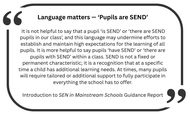 - ‘Every school leader is a leader of SEND’ – this resource contains ‘questions for reflection’ for school leaders (including governors) linked to the 5 key recommendations.