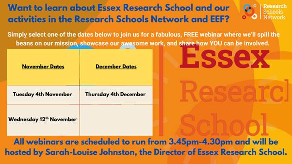 Latest updates from the Essex Research School - including Clips from the Classroom, details of upcoming Get to know Essex Research School webinars in November and December and an Early Years webinar in November in partnership with the REACHout Stronger Practice Hub.