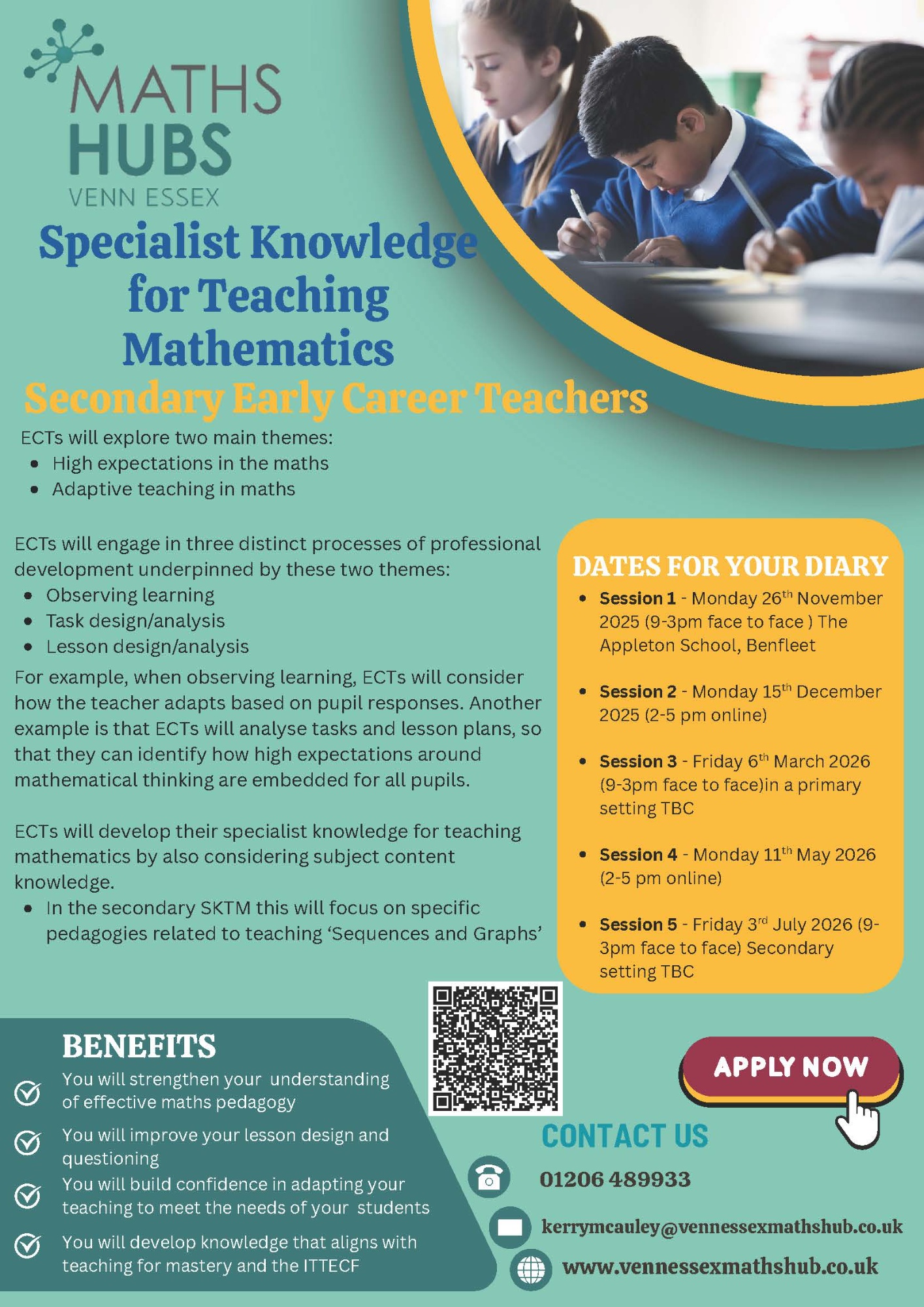 ECTs will develop their specialist knowledge for teaching mathematics by also considering subject content knowledge. Session dates: 26 November, 15 December, 6 March, 11 May, 3 July (click on the flyer image for full details) How to apply: