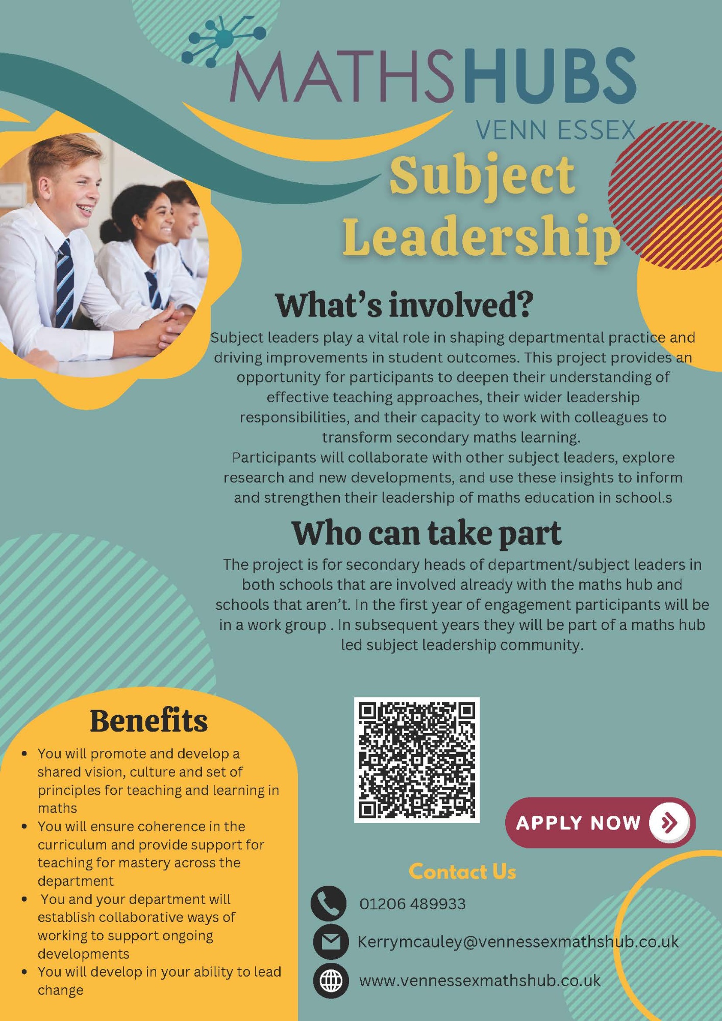 The project is for secondary heads of department/subject leaders in both schools that are already involved with the Maths Hub and schools that aren’t. In the first year of engagement, participants will be in a Work Group. In subsequent years, they will be part of a Maths Hub-led subject leadership community. How to apply: