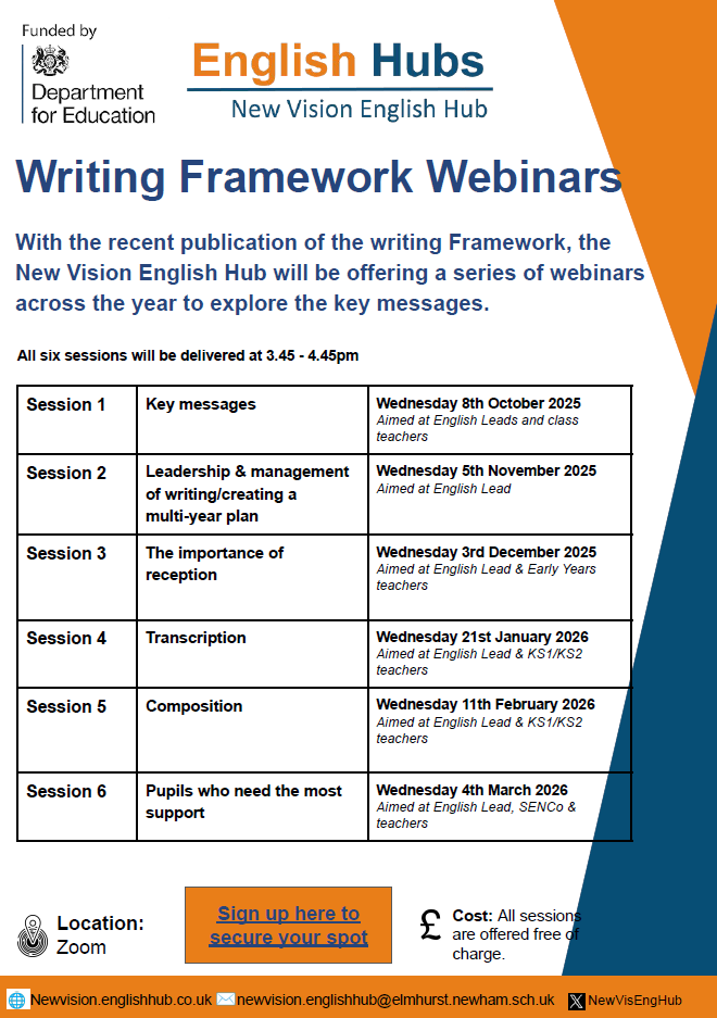 The New Vision English Hub is one of 34 English Hubs nationwide, funded by the Department for Education to support primary schools in achieving excellence in teaching reading and early language development. We provide free support to schools in North East London and Essex.