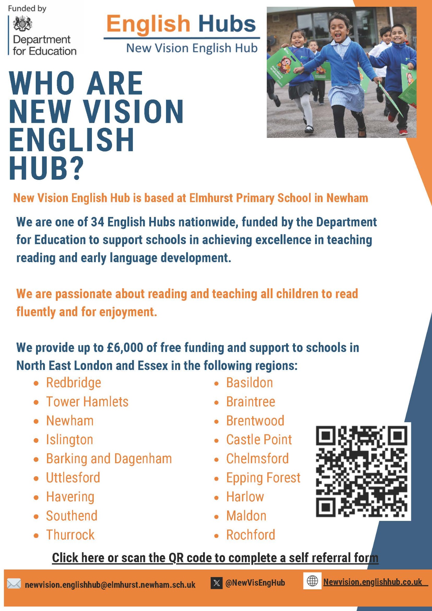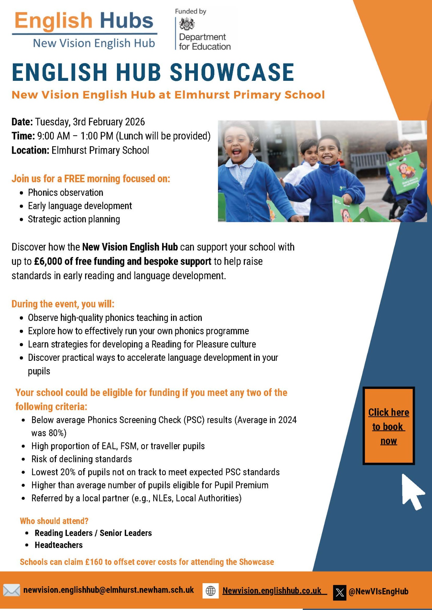 New Vision English Hub is based at Elmhurst Primary School in Newham. We are one of 34 English Hubs nationwide, funded by the Department for Education to support schools in achieving excellence in teaching reading and early language development.