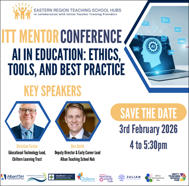 Save the date! On Tuesday 3 February 2026, the Eastern Region Teaching School Hubs will host their annual online conference for ITT mentors. The theme of this conference will be AI in Education: Ethics, Tools and Best Practice.