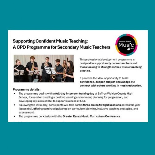 | 14 Nov 2025 Across the Greater Essex Music Hub, we provide Continuing Professional Development for all educational settings and their teachers. We offer networking and training for education professionals and music specialists and work in partnership with schools to... |